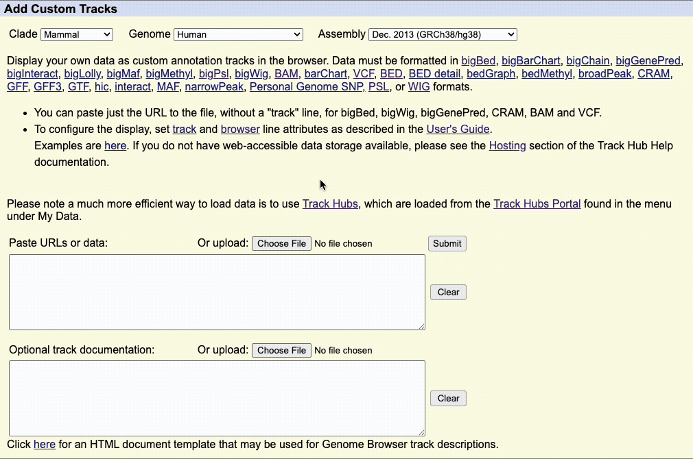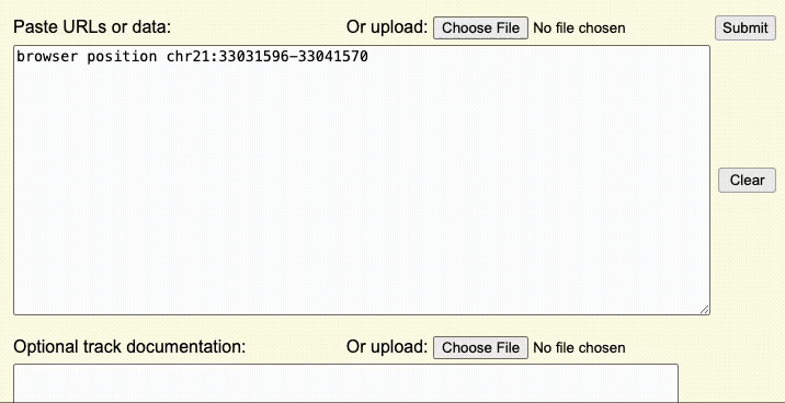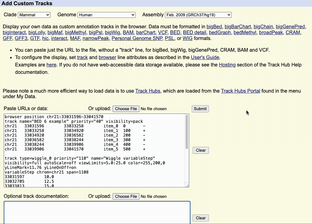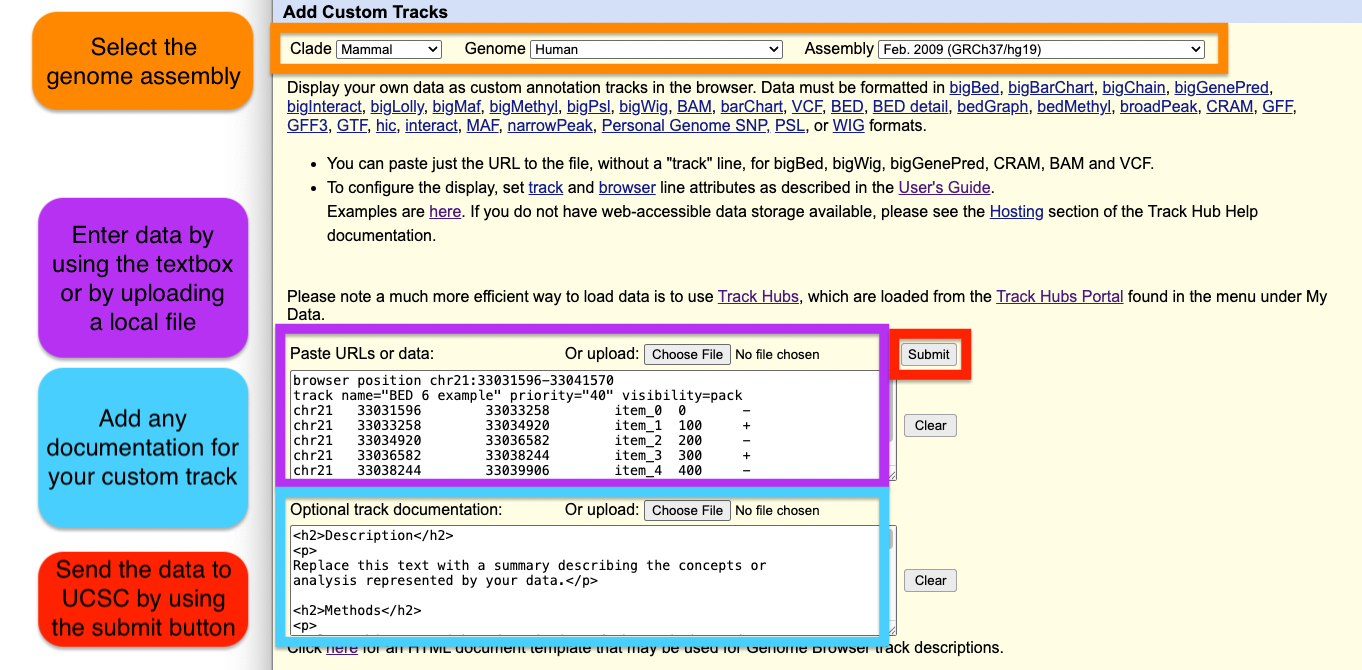 Once the Browser and track lines are created, you can upload the custom track to the UCSC Genome Browser using the dialogue box or the button to upload the custom track file.