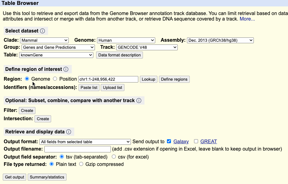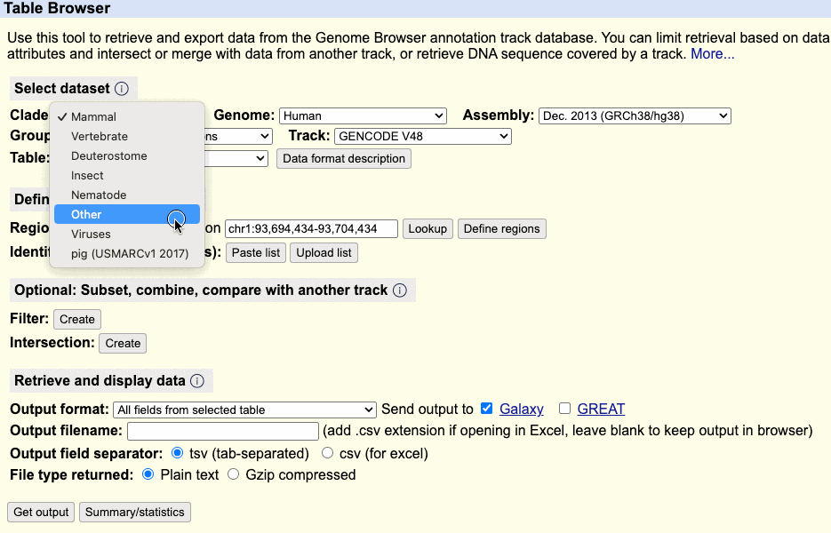 You can limit the output to a specific region or get data genome-wide. Whole-genome output may be unavailable for some tracks due to the large amount of data.