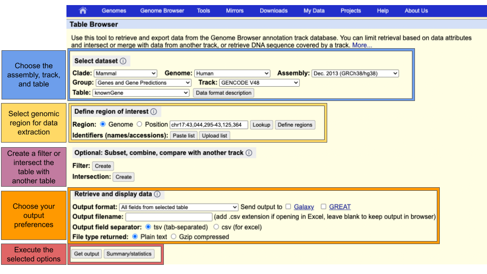 The UCSC Table Browser is a flexible tool for accessing and exporting data from genome browser tracks. This tutorial introduces the Table Browser interface and demonstrates how to: