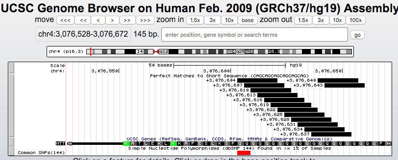 The above session uses the Short Match Track to display matches of "cagcagcagcagcagcag" repeats in a polyglutamine region (Note Qs) of the gene HTT, Huntingtin, linked to Huntington's disease.