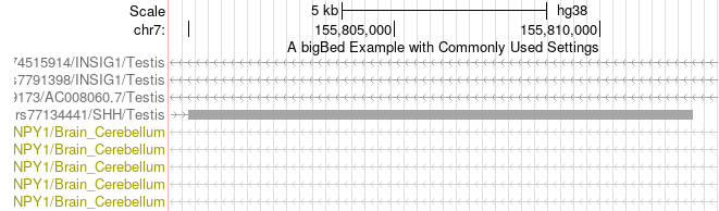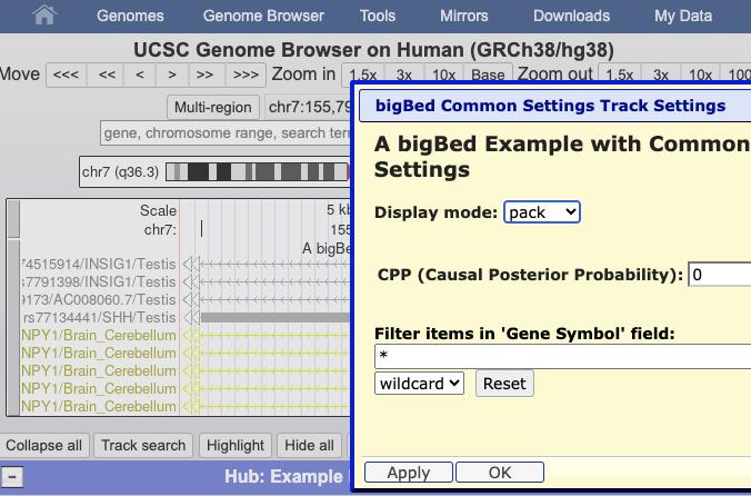 The bigBed format also offers a wide range of customization options for the display, from decorators to highlights. Additionally, it offers extensive filter controls, searching options, and mouseover configurations. Our trackDb documentation contains a full listing of settings available for the format.