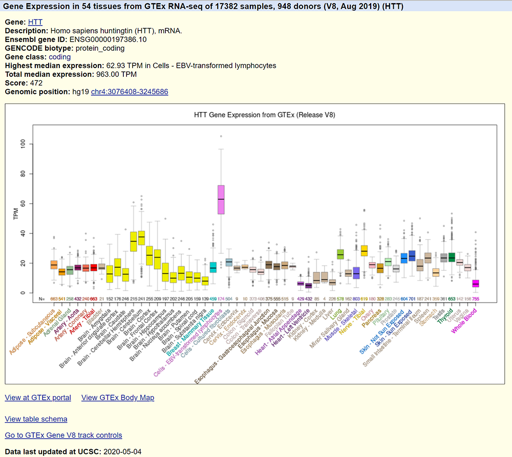 Figure 3. Gene expression page for HTT gene with a more detailed general overview for expression of the gene.