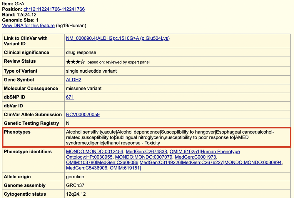 Turning on the ClinVar track and viewing ALDH2 on the Genome Browser further confirms this variant's pathogenicity (Figure 11). Take note of the red bead (which indicates a pathogenic variant) and the phenotypic consequences mentioned on the ClinVar details page, accessed if you click into the variant's gray box (Figure 12). The details page lists that some of the pathogenic phenotypes rs671 has been linked to are alcohol sensitivity, esophageal cancer, and others.