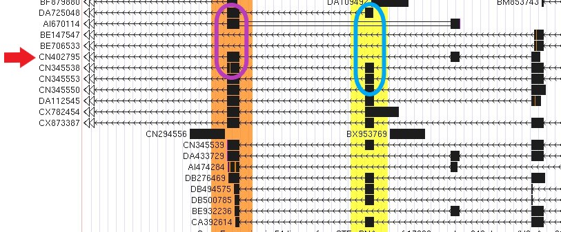 Furthermore, in Figure 3, the orange highlight marks exon 7,where we can see within the purple circle two more examples of EST reads with exons spliced out: BE706533 and BE147547. These two variants are missing exon 7 (orange highlight) and are also missing exon 6 (yellow highlight).